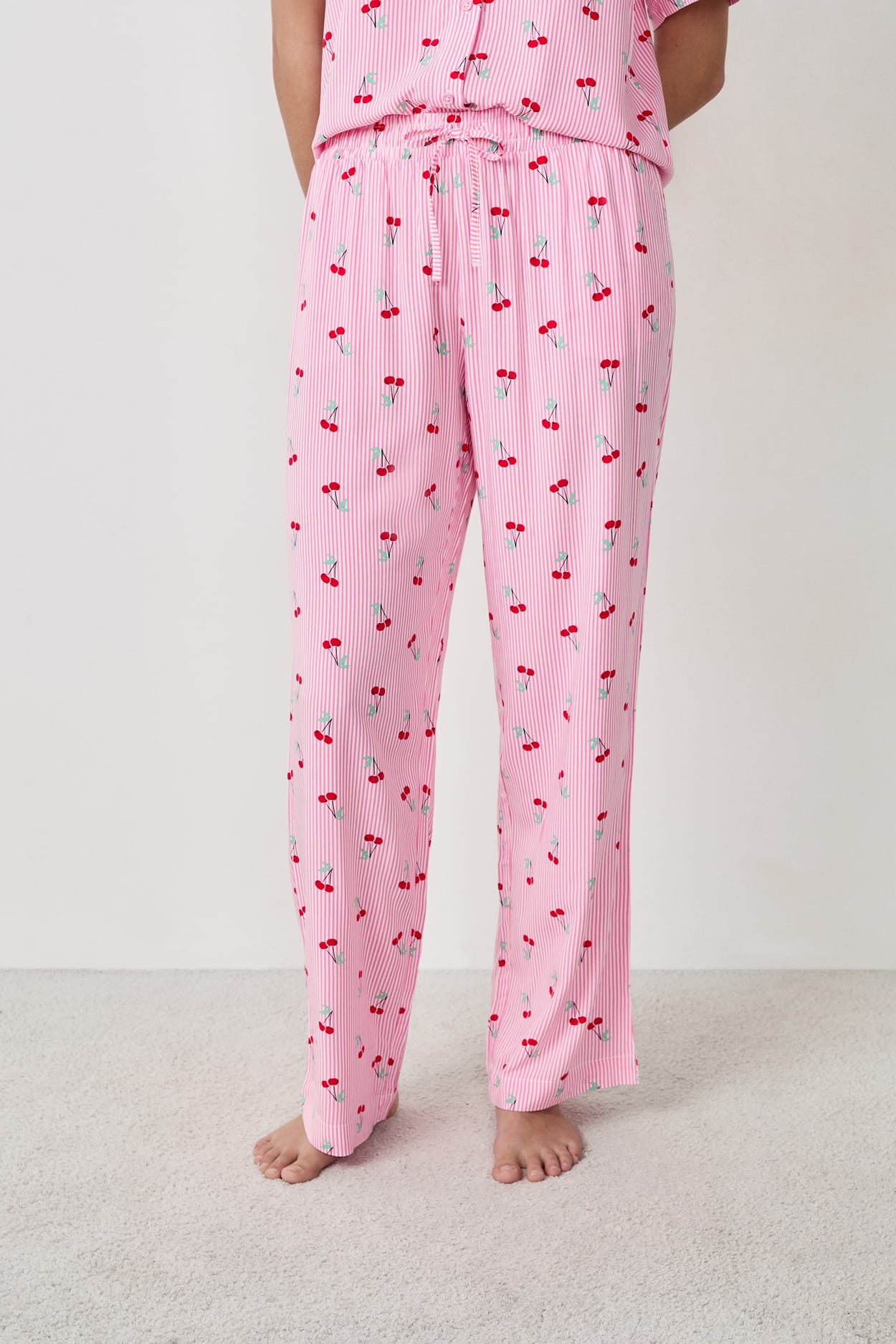 Kirschen schmücken diese Pyjama-Hose im All-over-Design. Die Silhouette ist dank des ausgestellten Schnitts fliessend un...