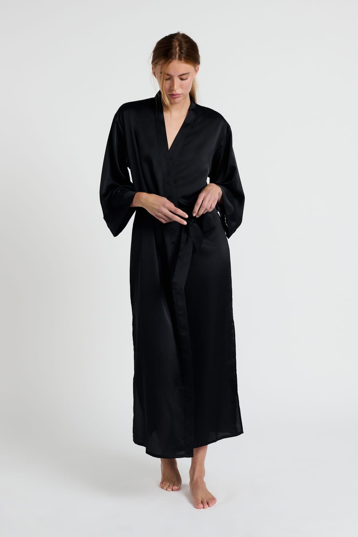 Als zeitloser Klassiker ist dieser lange Kimono aus Satin mit langen Ärmeln und einem Bindegürtel an der Taille ausgesta...