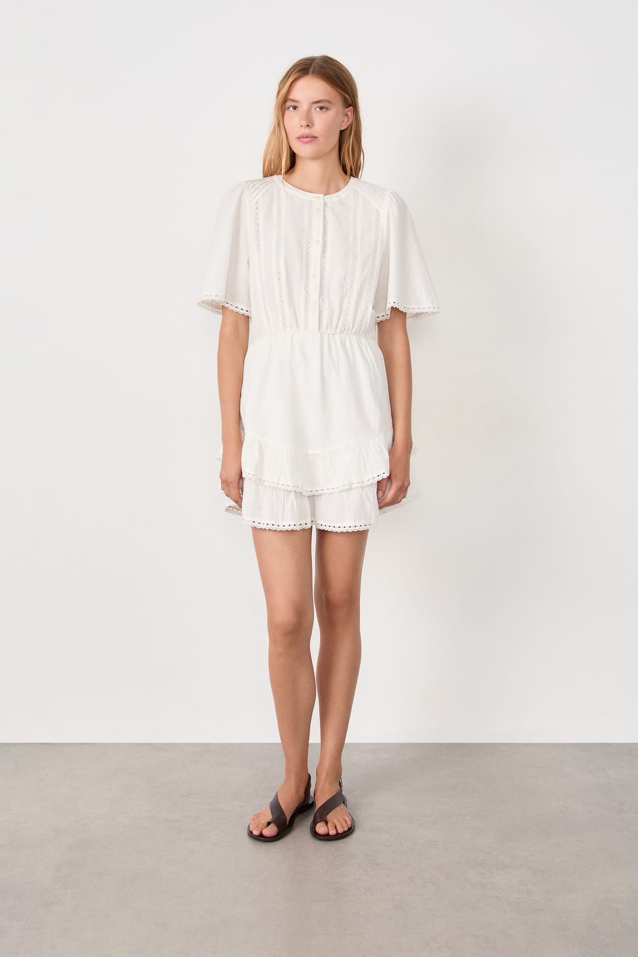 Sur cette robe en coton, les détails raffinés se multiplient : volants, broderies ajourées et fermeture boutonnée. Elle ...