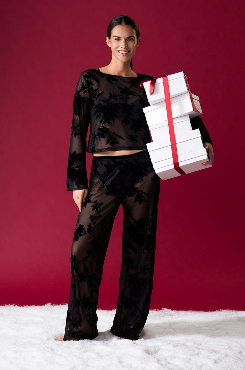Ganz transparent präsentiert sich dieses langärmelige Top mit einer mit Samt beflockten floralen Spitze....