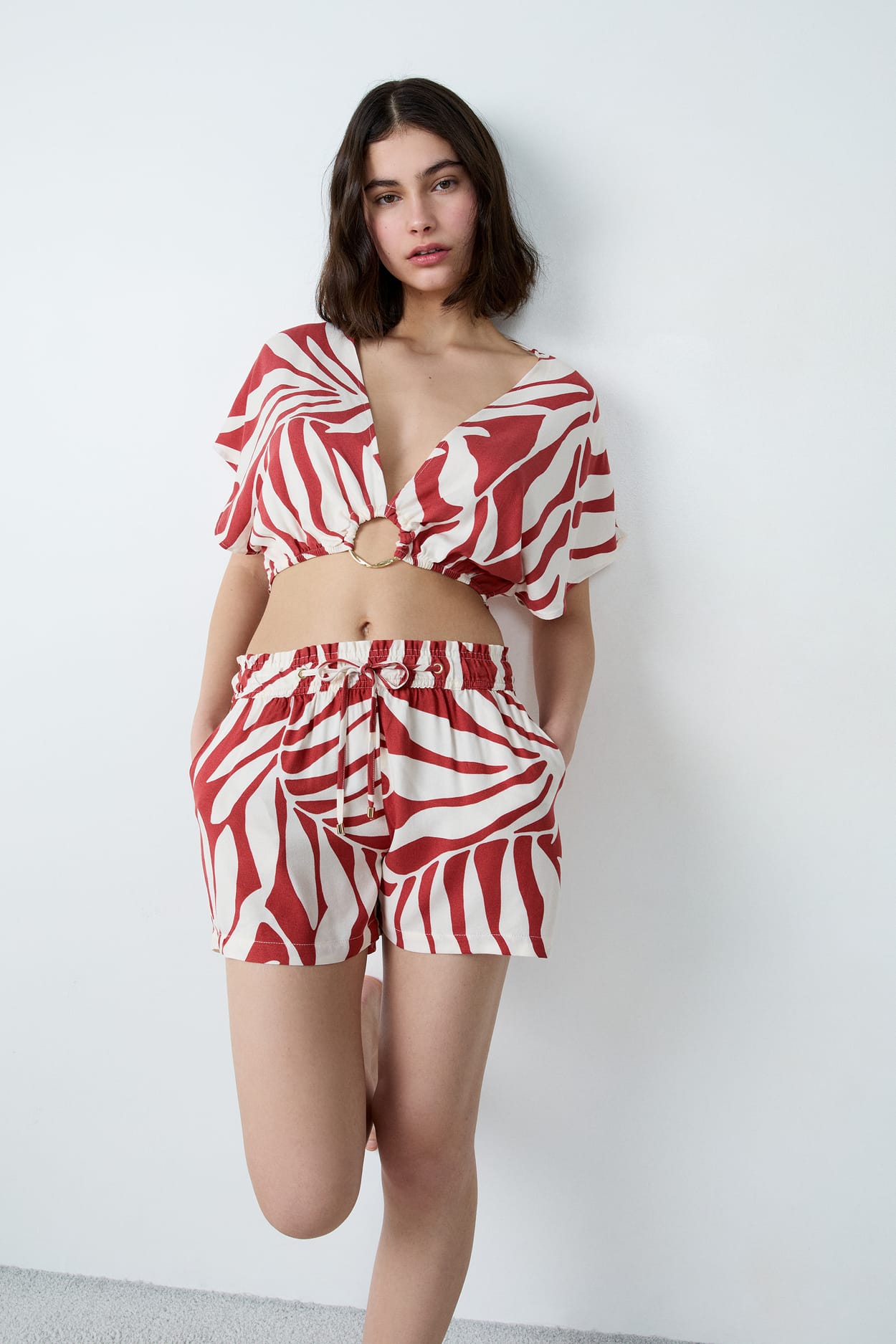 The look is light and airy, enhanced by a tropical print and a golden ring on the front.