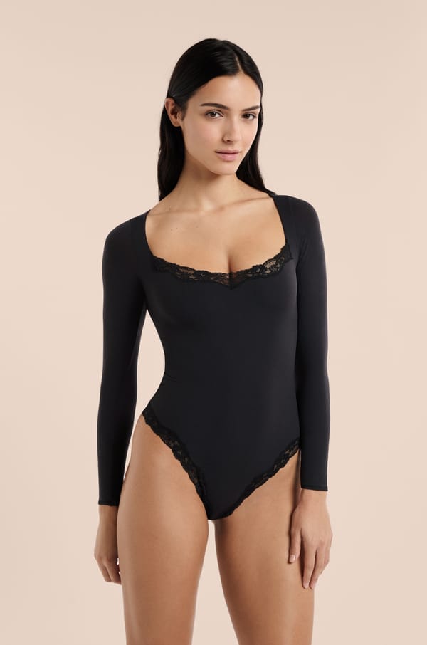 Long-sleeved bodysuit in microfibre and lace;${refinementColor}
