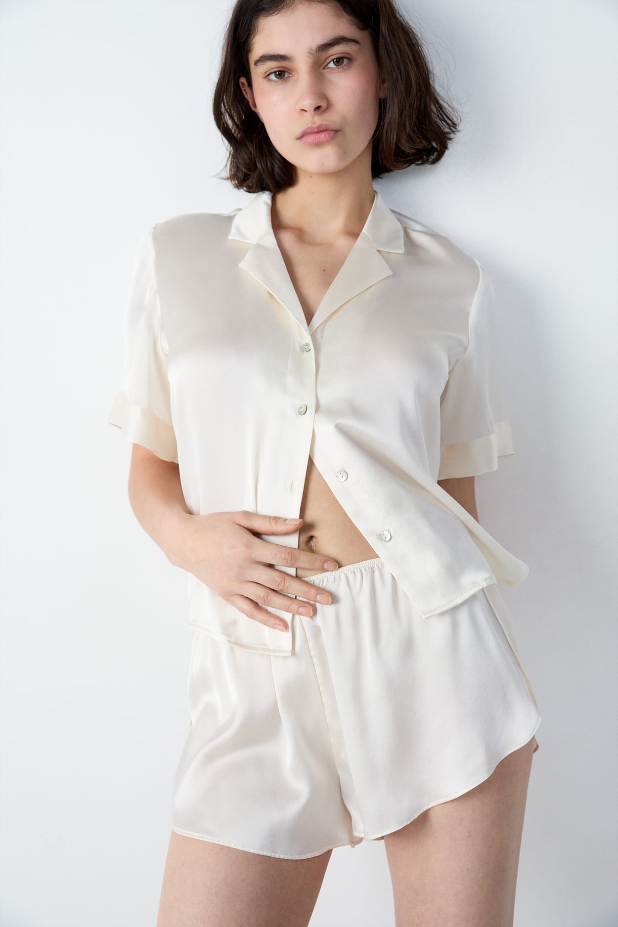 A soft and precious material for chic nights. These silk shorts reveal two small slits on the sides. They pair perfectly...
