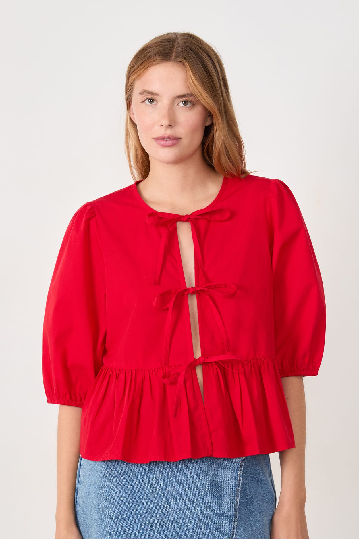 A must-have for the season, this blouse with 3/4 sleeves ties at the front. Slightly ruffled and featuring puff sleeves,...
