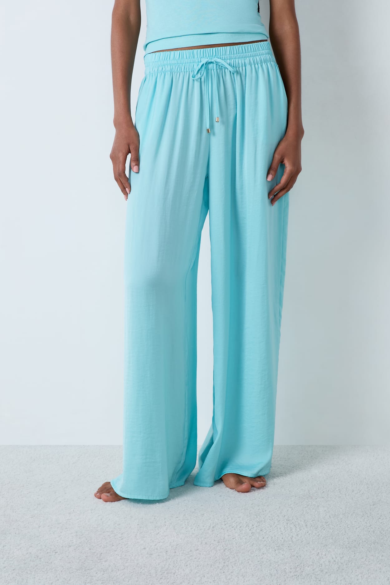 Delicately satin, these trousers feature drawstrings to tie around the waist and gathers. With its wide cut, it brings t...
