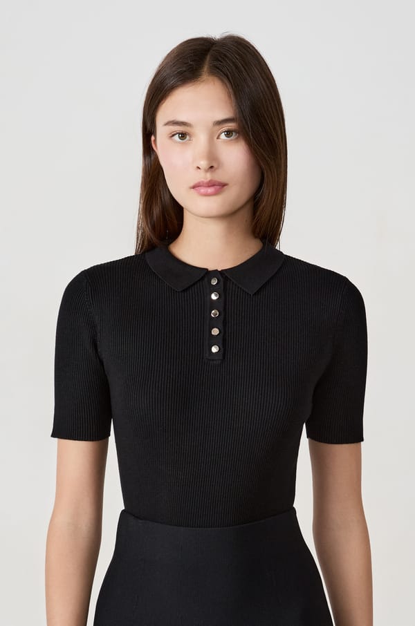 Ribbed short-sleeved T-shirt with buttoned collar;${refinementColor}