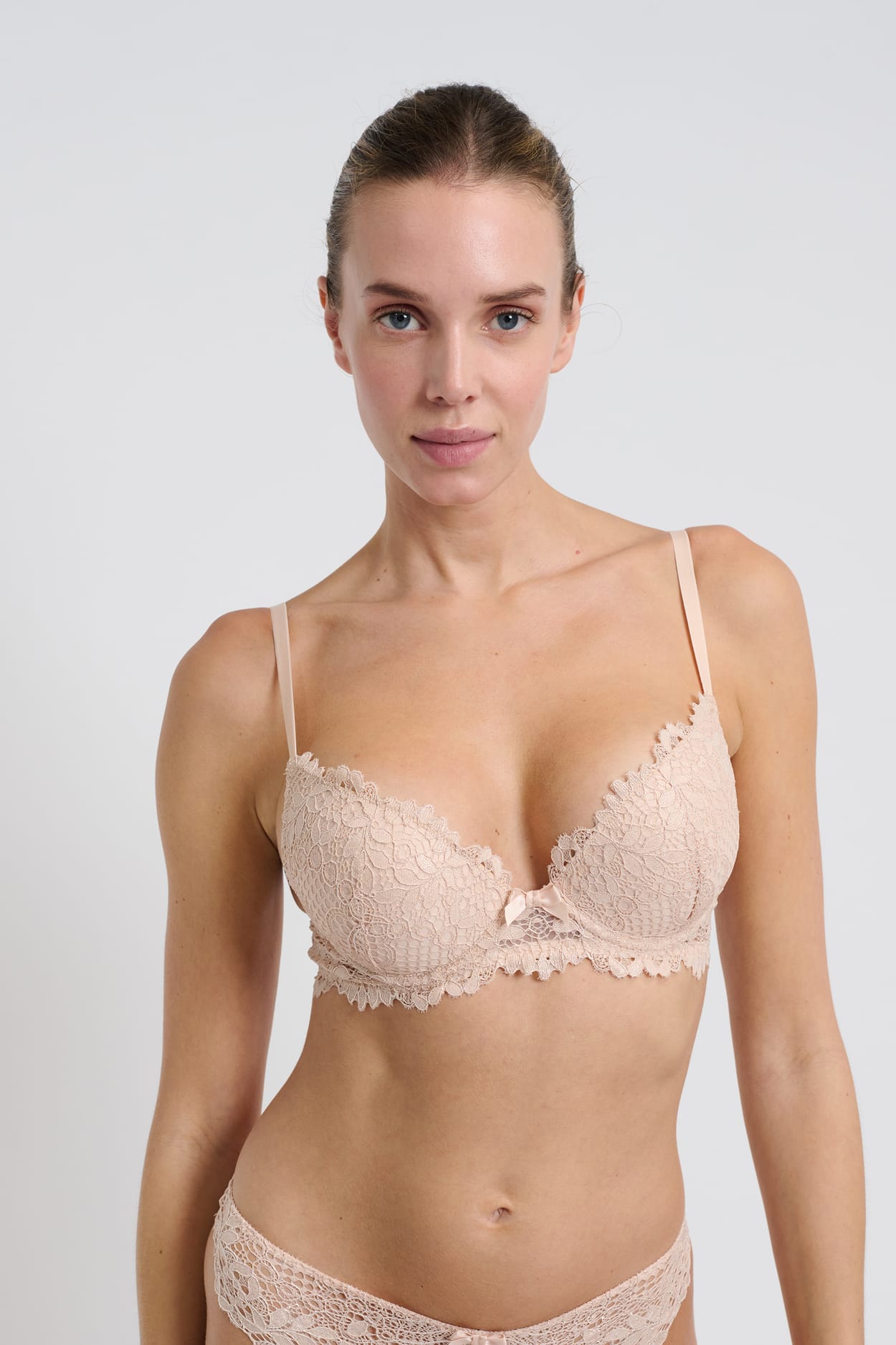 Thanks to its discreet cups, the neckline gains a size and displays a lovely pigeon-breasted shape in this push-up bra crafted from our signature Success lace.