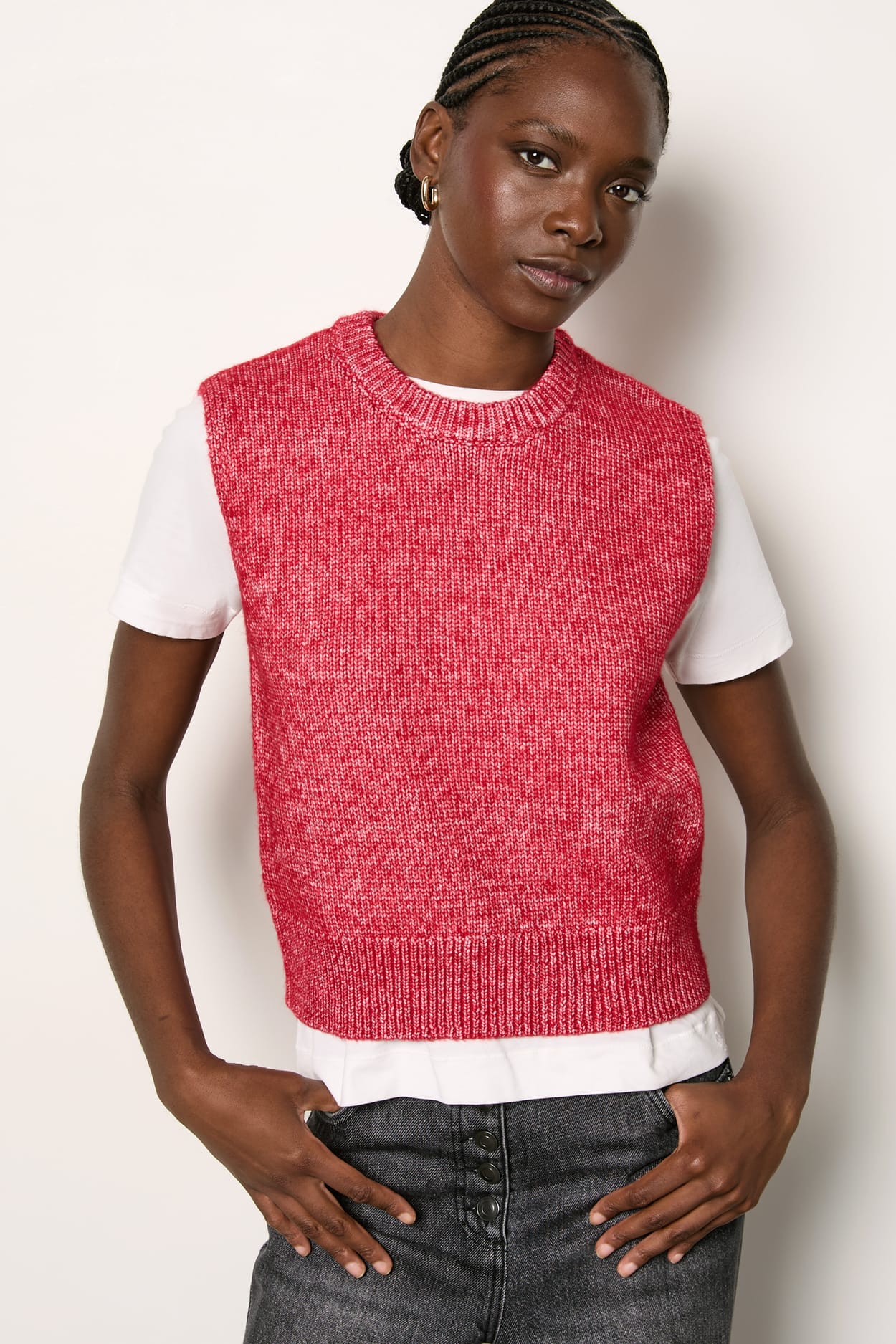 Classic and timeless, this sleeveless fine-knit sweater is a must-have for mastering the art of elegant layering. Whethe...