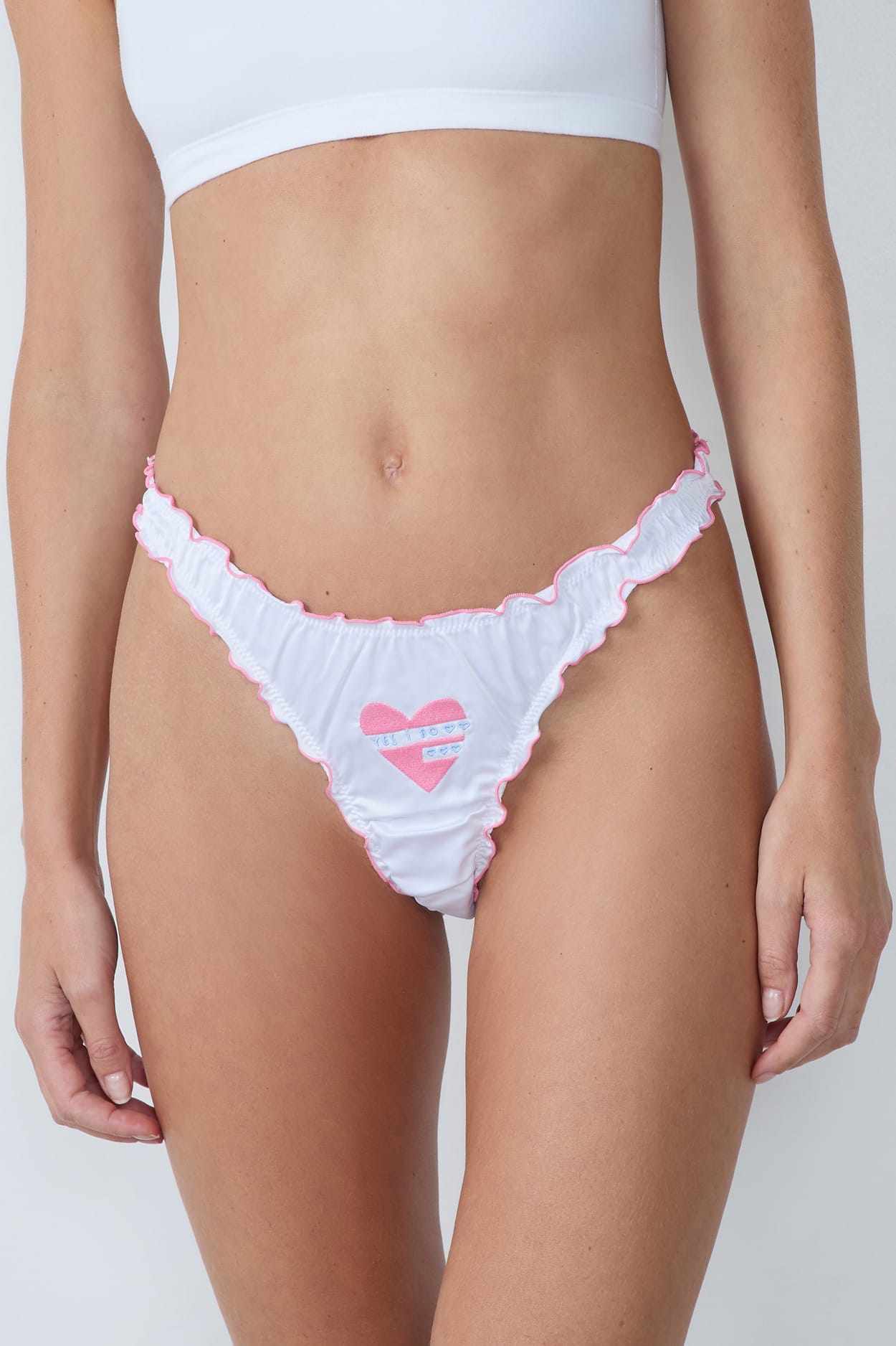 Light and delicately ruffled, this satin bloomer thong, adorned with heart embroidery, charms with its cut....
