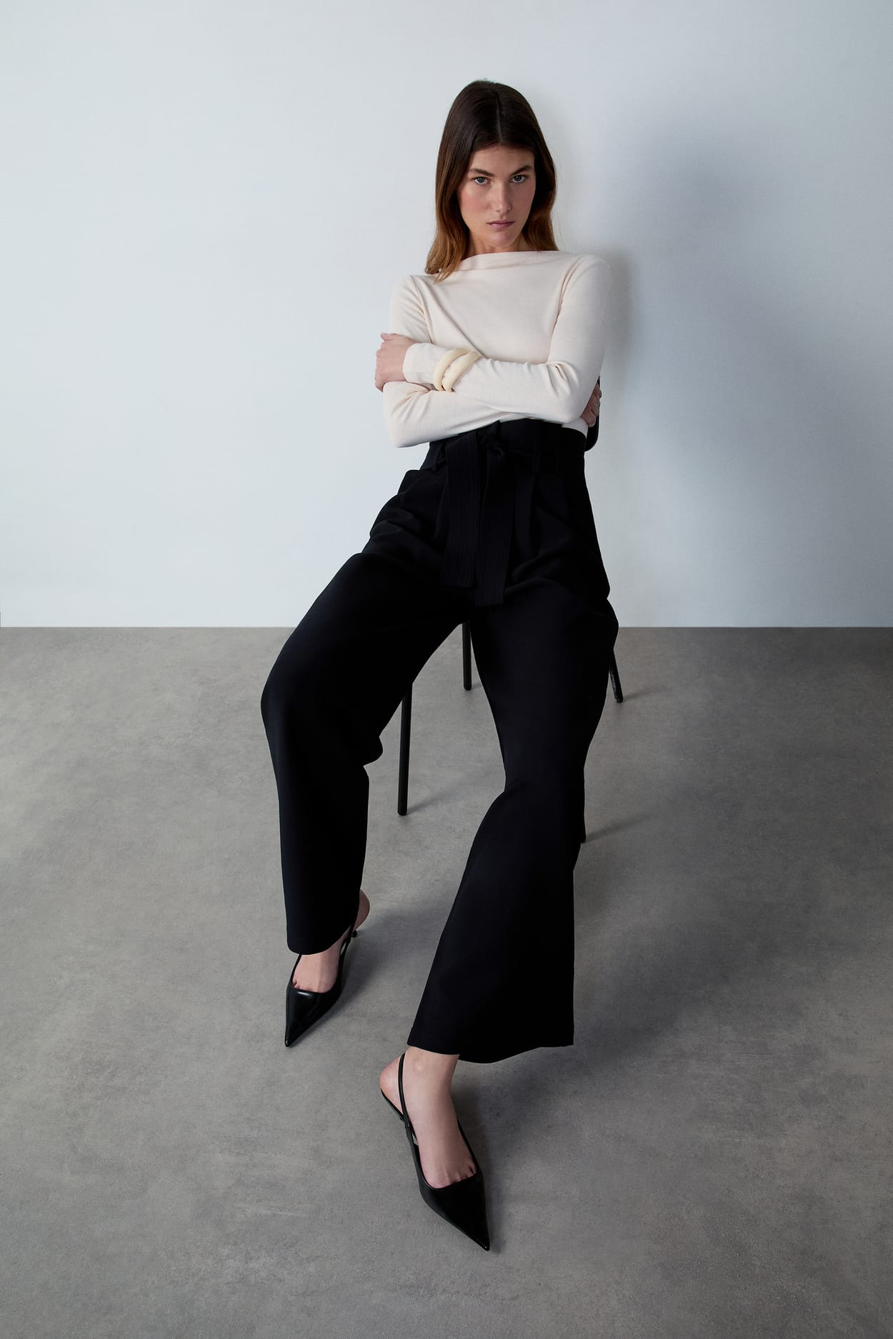 A timeless wardrobe piece, these wide-leg trousers structure the silhouette with their tie-waist belt.