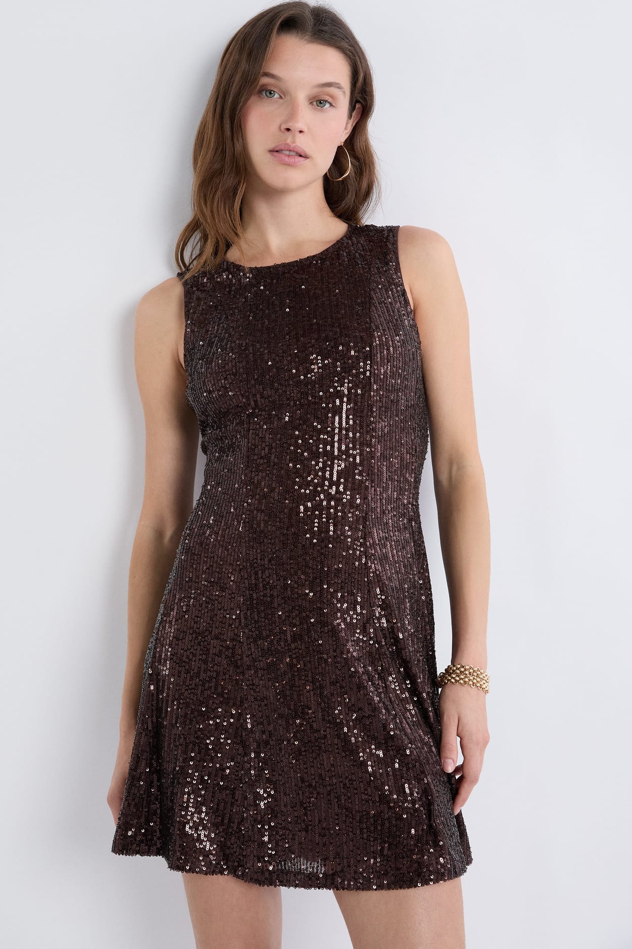This sleeveless dress is adorned with sequins. It offers a festive and elegant look....