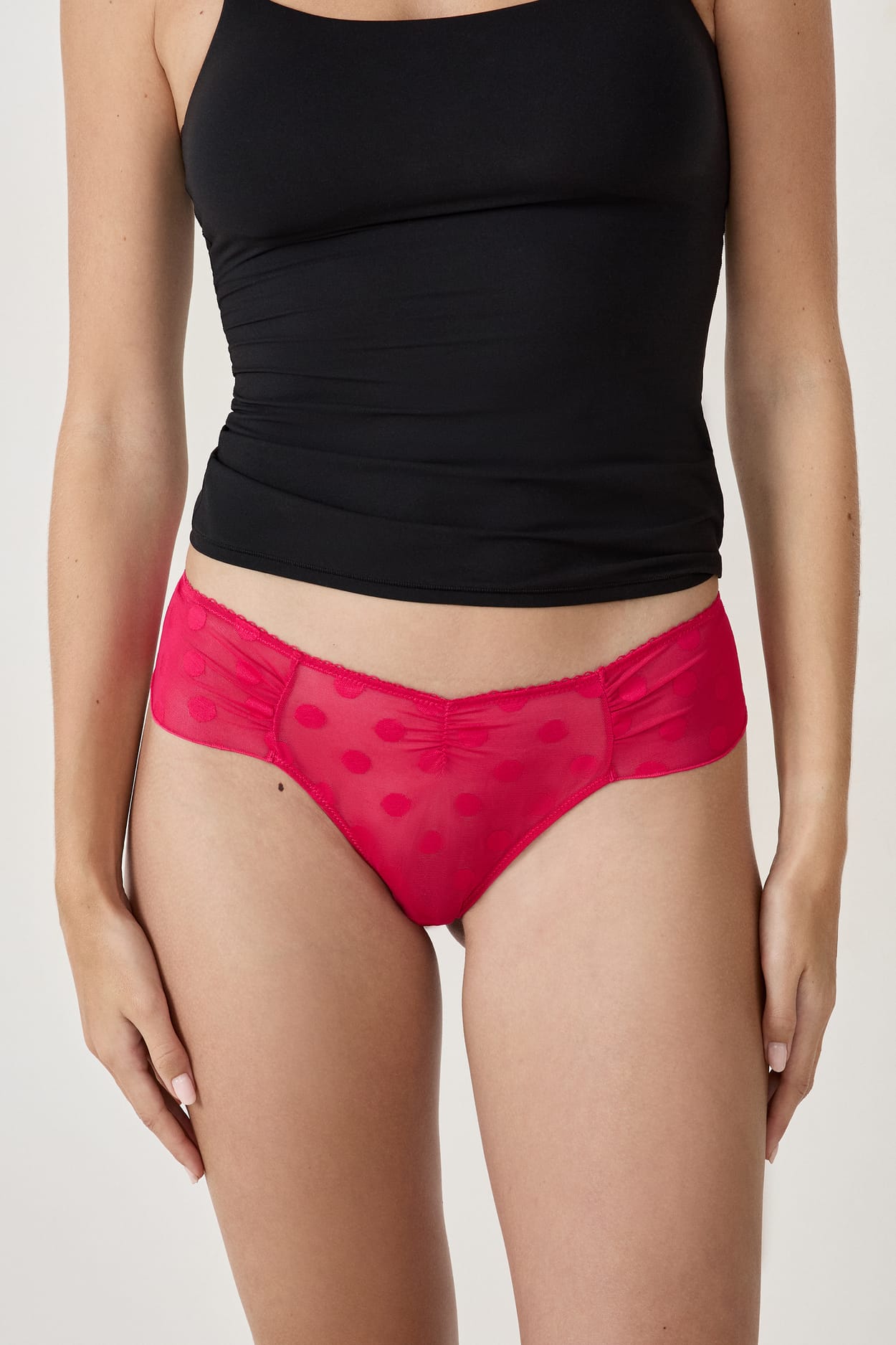 Ce hipster en tulle transparent opte pour un motif à pois. Il est muni d'un nœud à l'arrière pour une note sex...