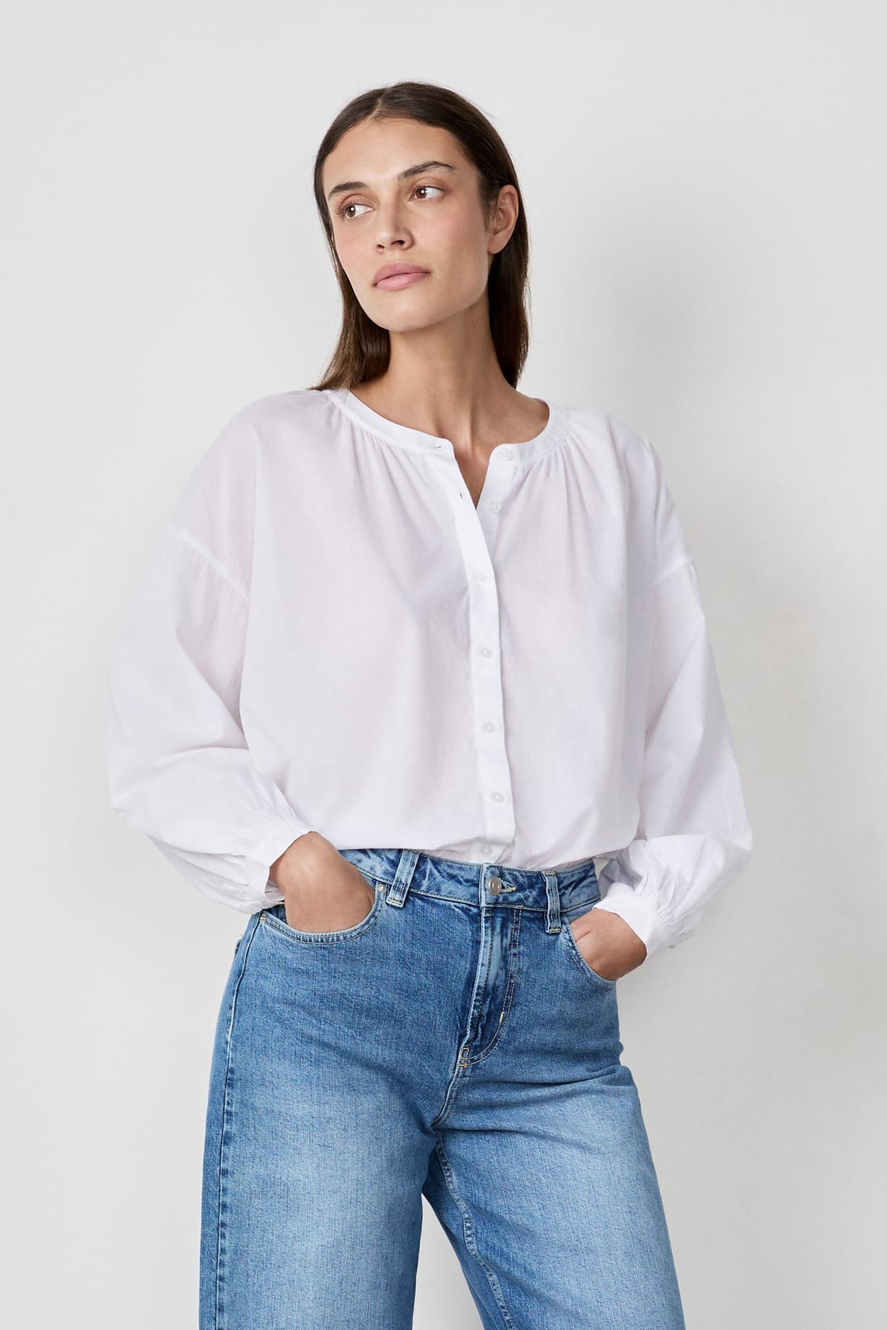 The minimalist wardrobe is reinvented with this round-neck shirt. Its long puffed sleeves bring an airy touch to the loo...