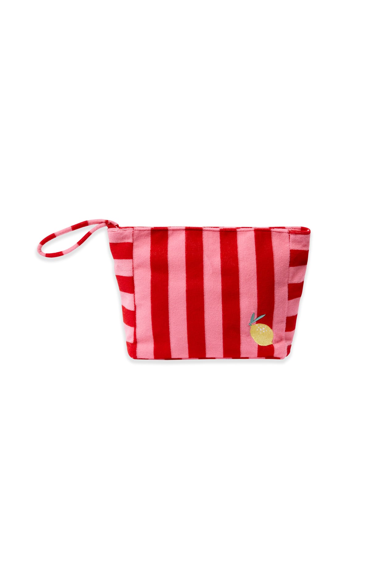 Cette pochette en éponge à rayures accueille vos essentiels de l'été. Facile à glisser dans un sac de plage, elle se ferme par un zip et se distingue par son détail citron : la touche tendance de la saison.