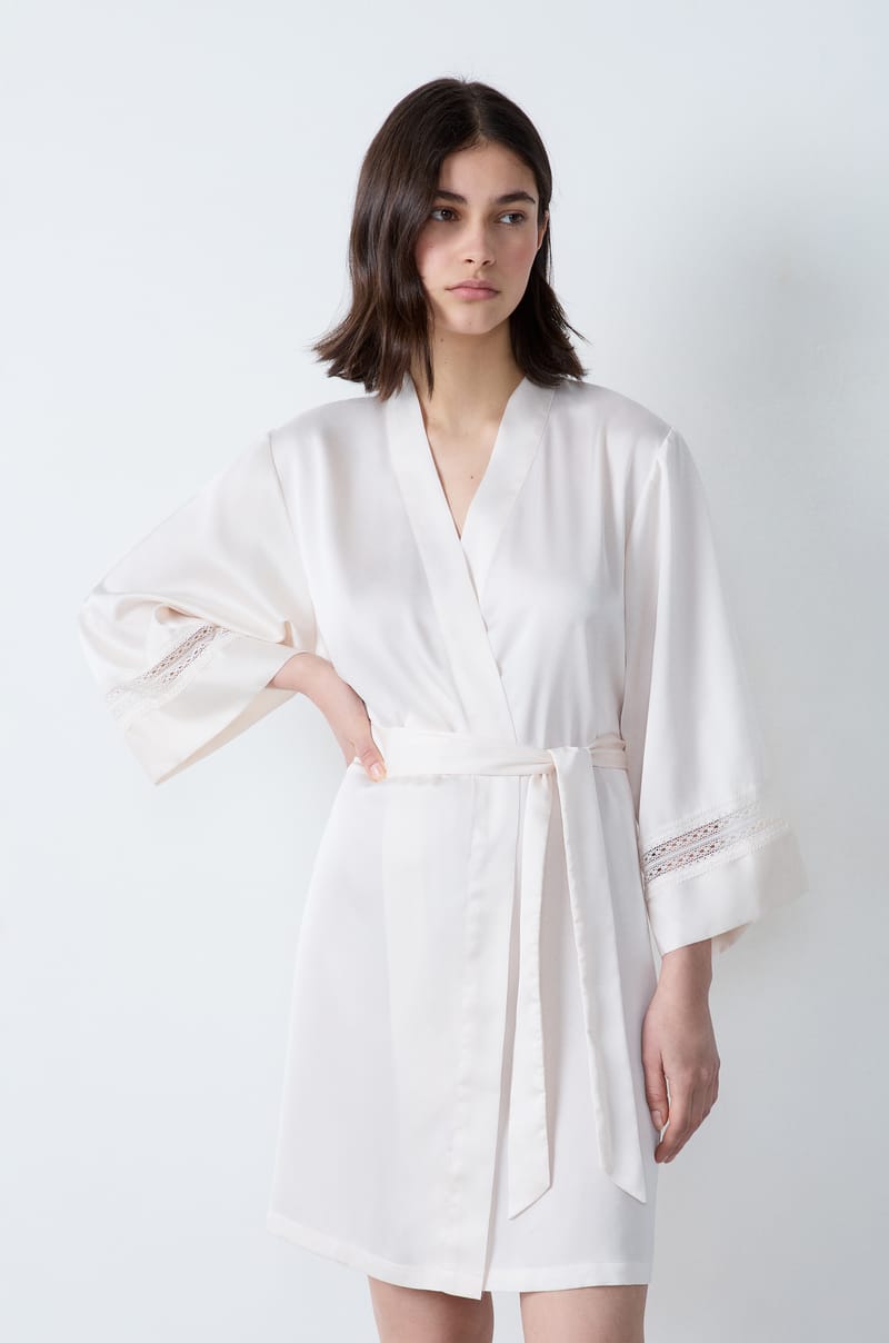 This satin robe is distinguished by delicate lace that enhances the back and sleeves. Elegant and refined, it ties at the waist to create a structured and sophisticated silhouette.