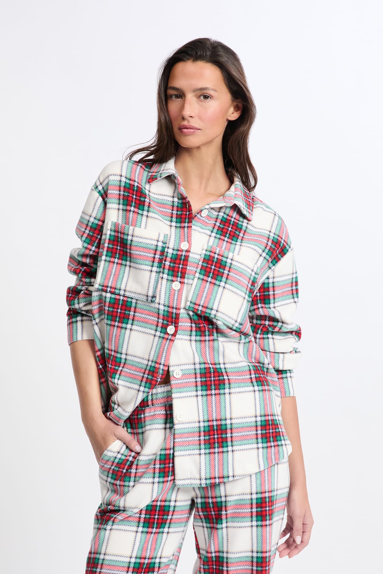 Imprimé star de la saison, cette chemise de pyjama s'habille de carreaux. Munie de manches longues et d'une coupe large, elle s'associe avec le pantalon assorti.