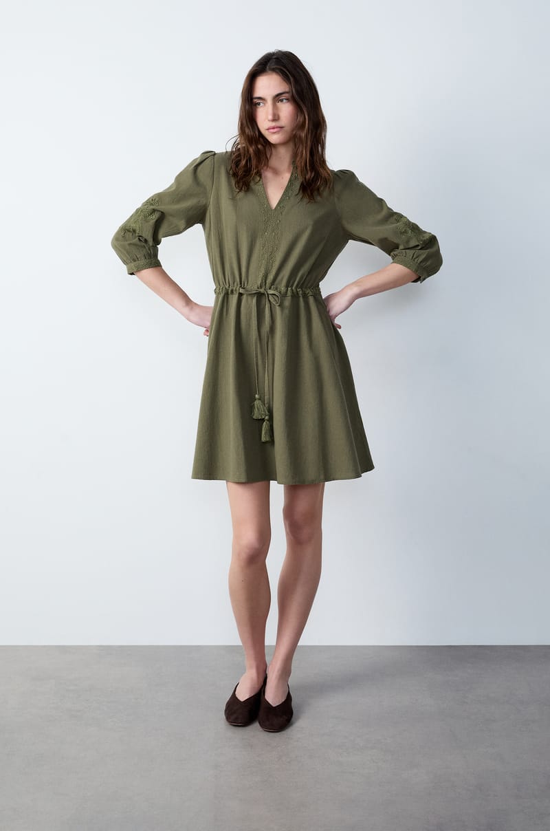 Light and delicately embroidered, this soft cotton dress features multiple meticulous details. We love its ties punctuated with pompoms, and its Tunisian collar adorned with tone-on-tone embroidery. Fitted at the waist, it reveals a flared skirt that enhances the silhouette.