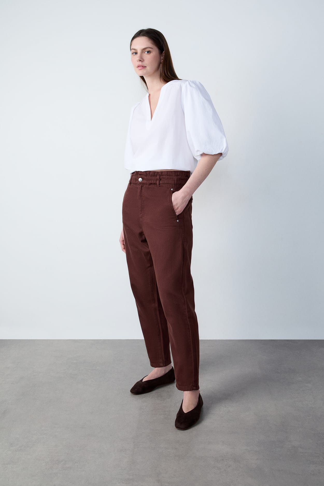 With its intense raw blue, this carrot-cut jean enhances your silhouette thanks to its smocked waist. A must-have for yo...