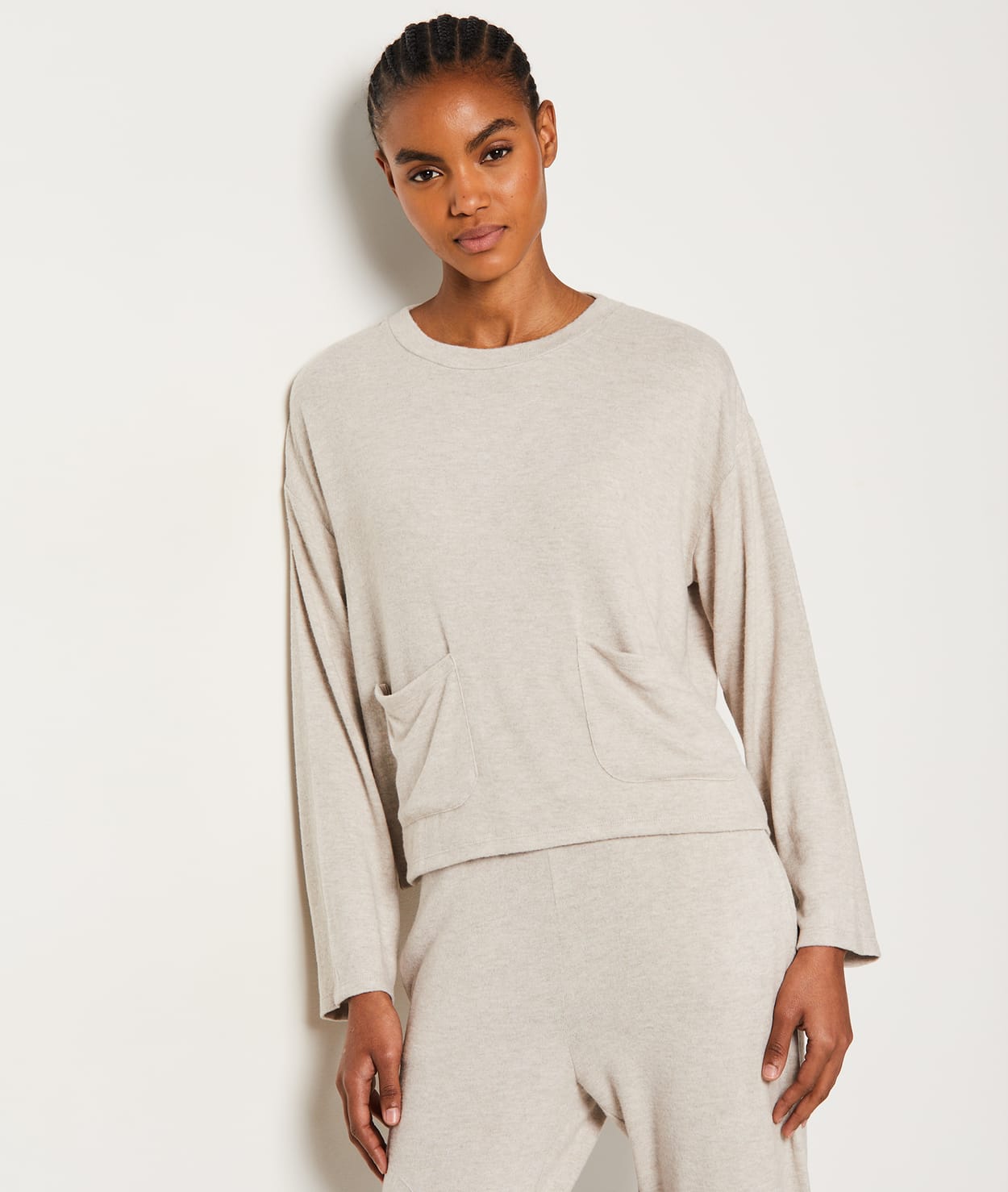 Wrap yourself in softness with this long-sleeved, round-neck pyjama sweatshirt. Its slightly oversized cut makes it the ideal companion for your cocooning moments. Wear it with the matching trousers for a soft and comfortable set.