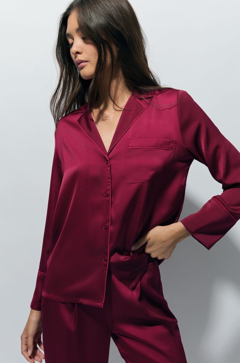 Elegant and refined, this long-sleeved satin pyjama shirt is enhanced with contrasting piping. It offers a fluid cut for...