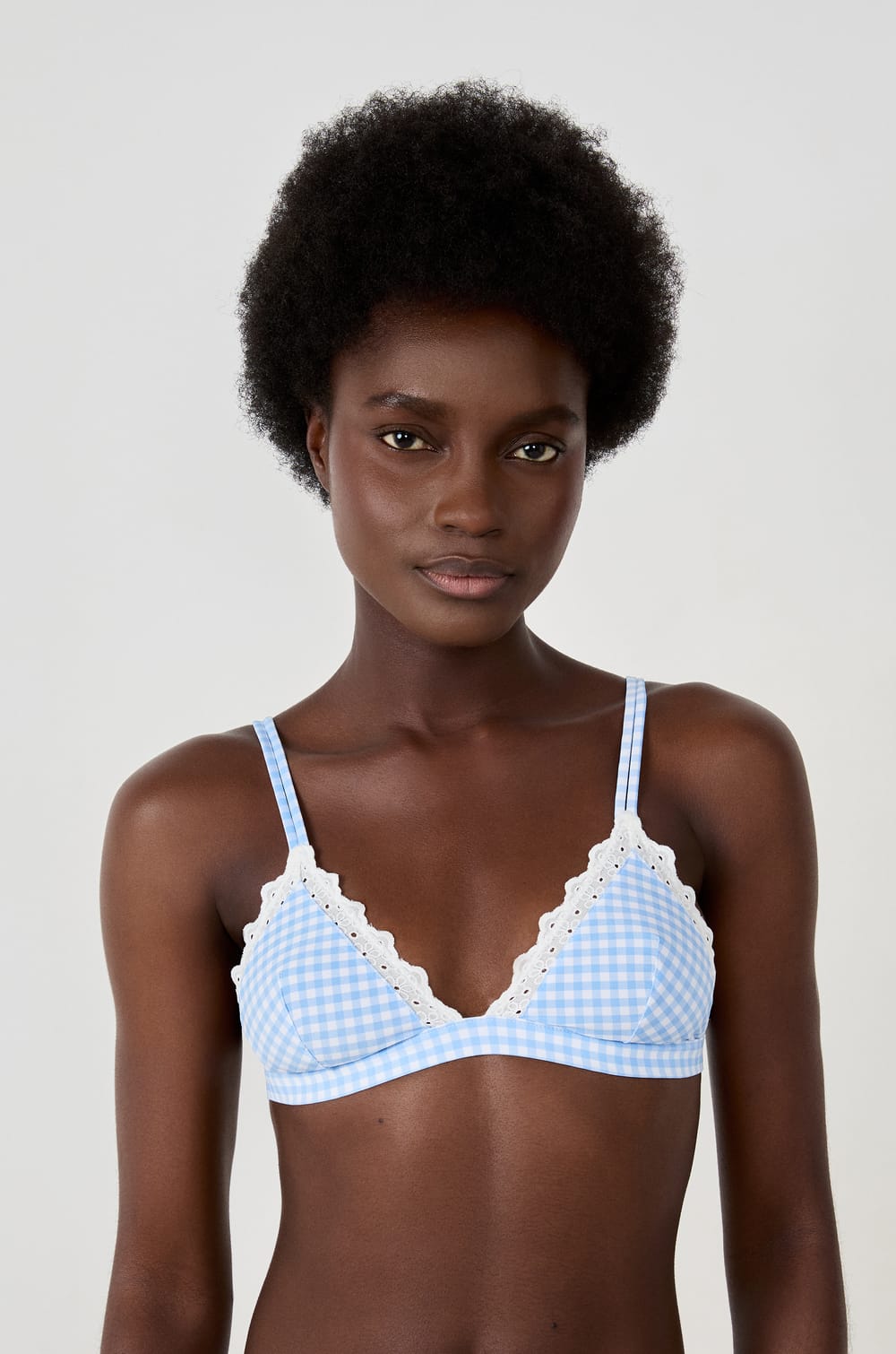 This triangle bra is adorned with irresistible details, combining a gingham print with English embroidery trim. Equipped with lightly lined cups and wireless, it naturally enhances the shape of the bust.