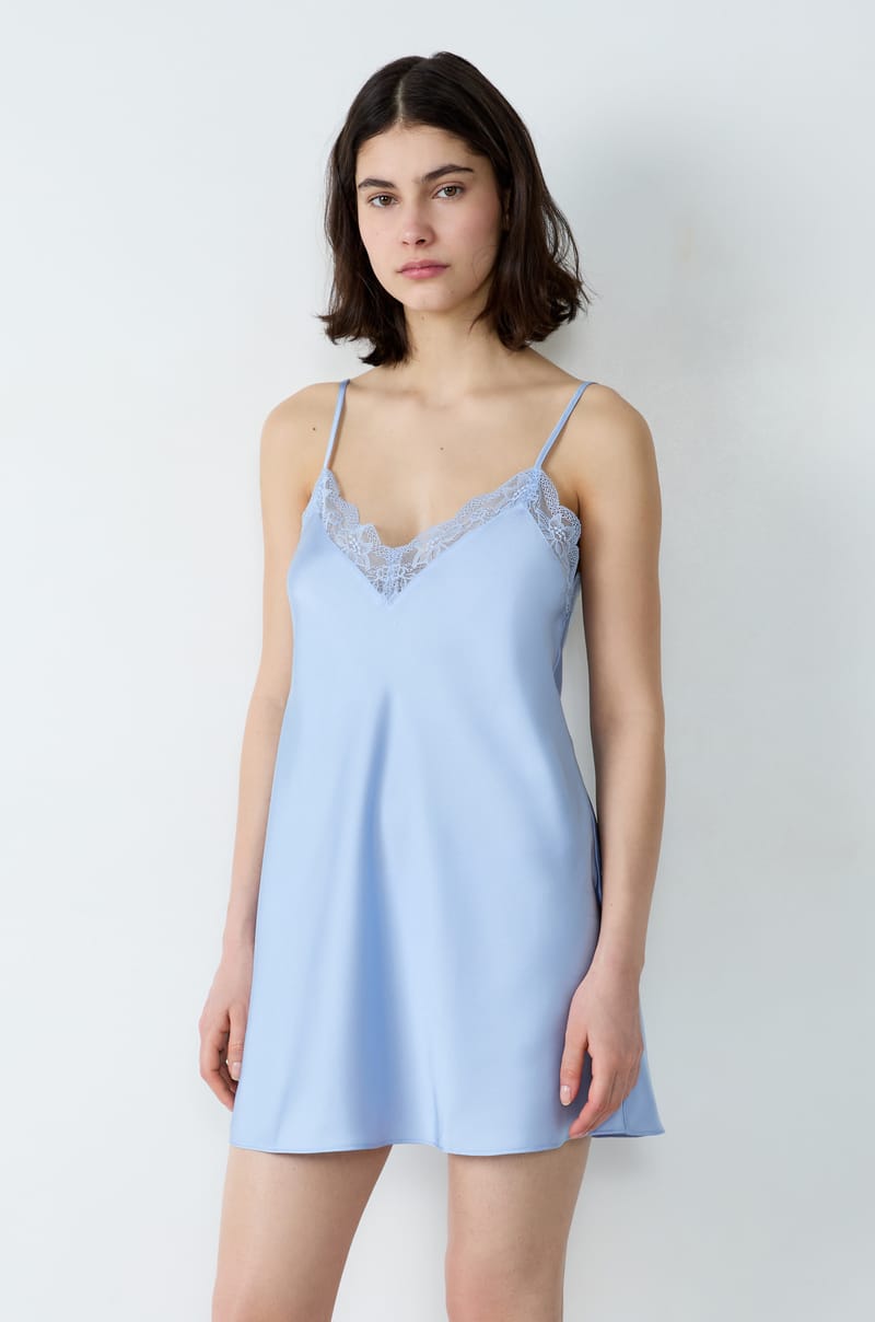 The essential for chic nights? A short nightdress, satin and edged with delicate floral lace.With its thin adjustable st...