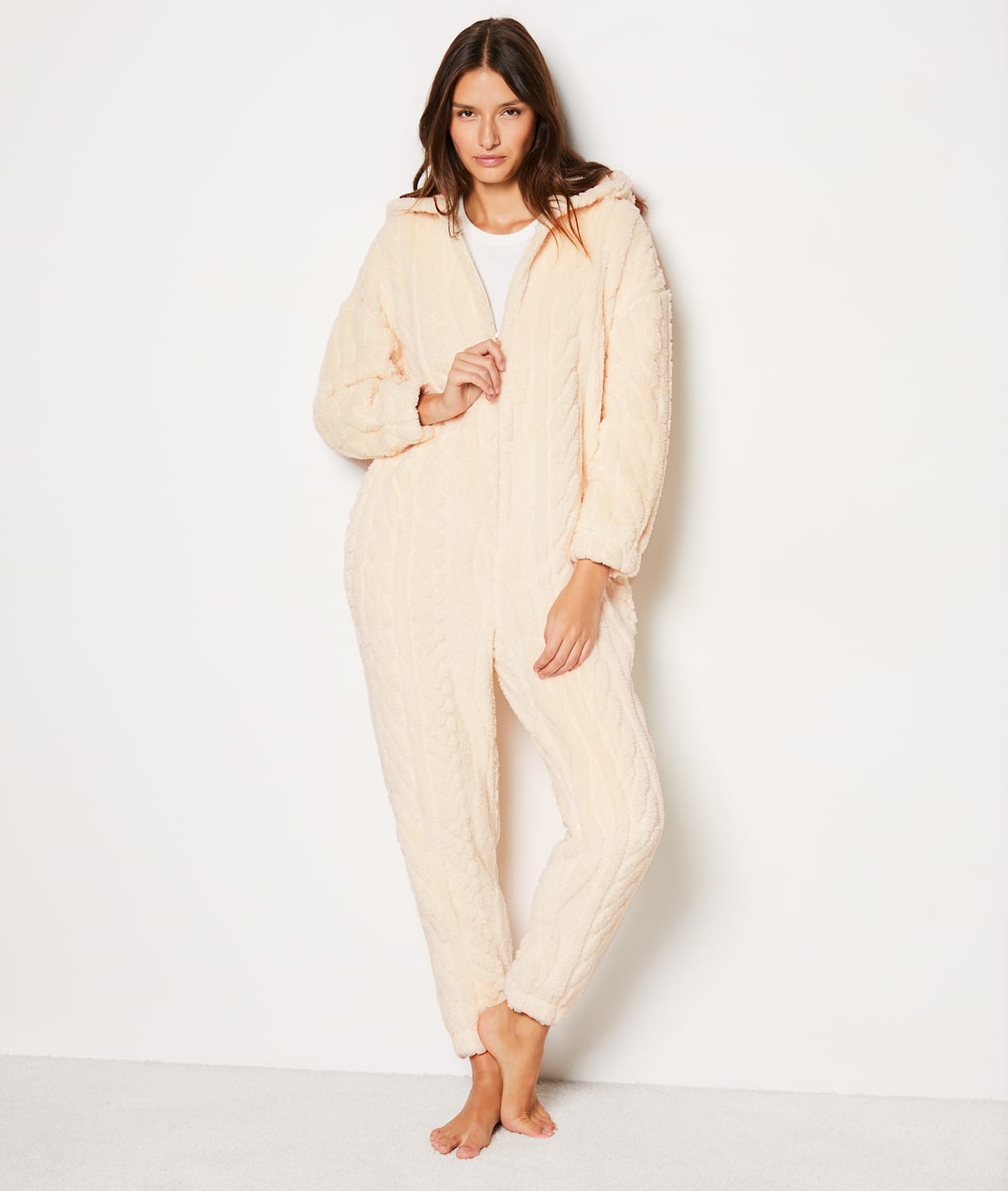 A very soft and textured material: wrap yourself in this ultra-comfy fleece jumpsuit. With its zip closure and hood, it offers you cosy evenings combining warmth and style.