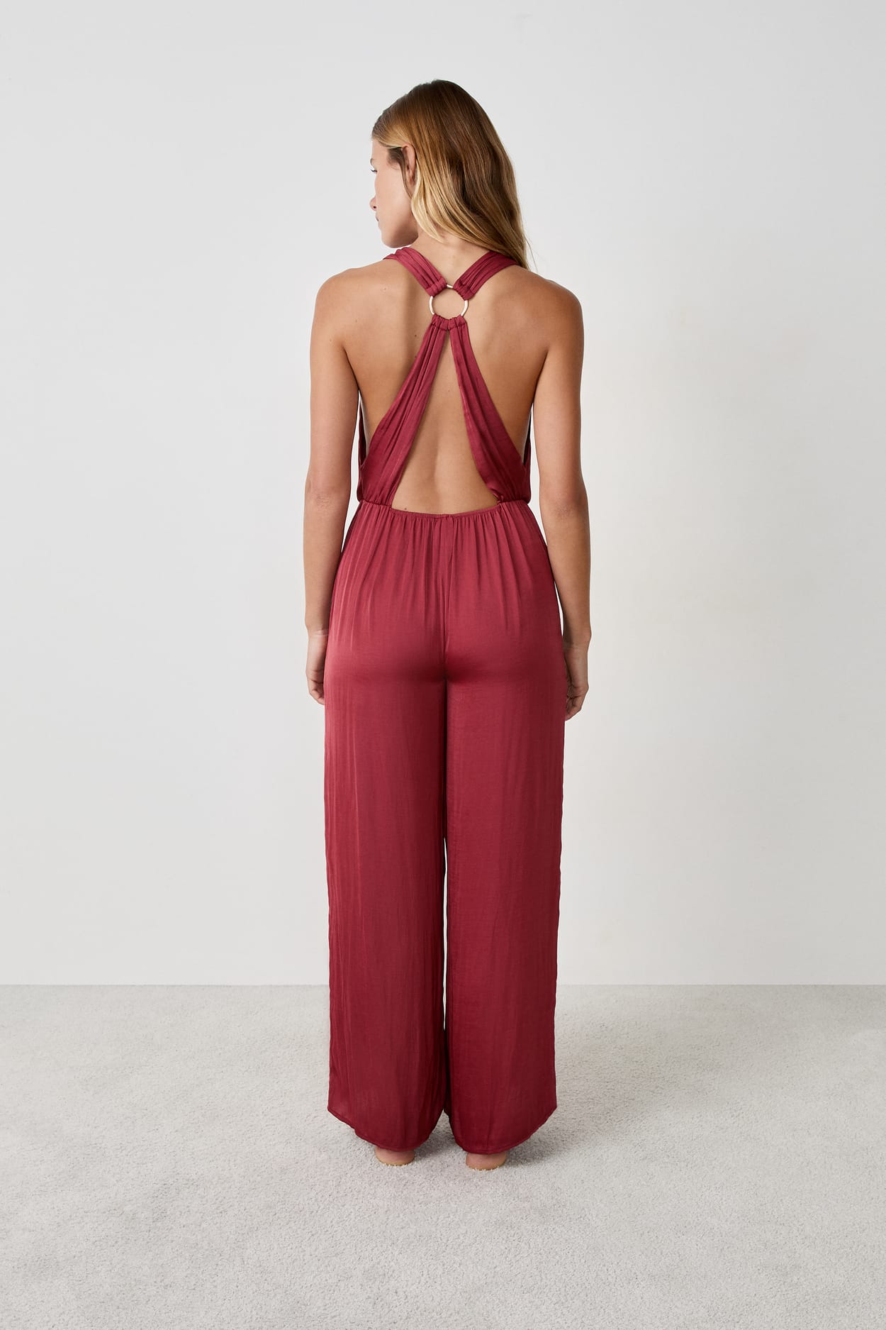 A wardrobe classic, the jumpsuit is reinvented with new seams. The drapes are fluid, creating a refined silhouette while offering great freedom of movement. On the front, a crossed drape enhances the bust. At the back, a play of delicately gathered fabrics, punctuated by a golden ring, enhances the look.
