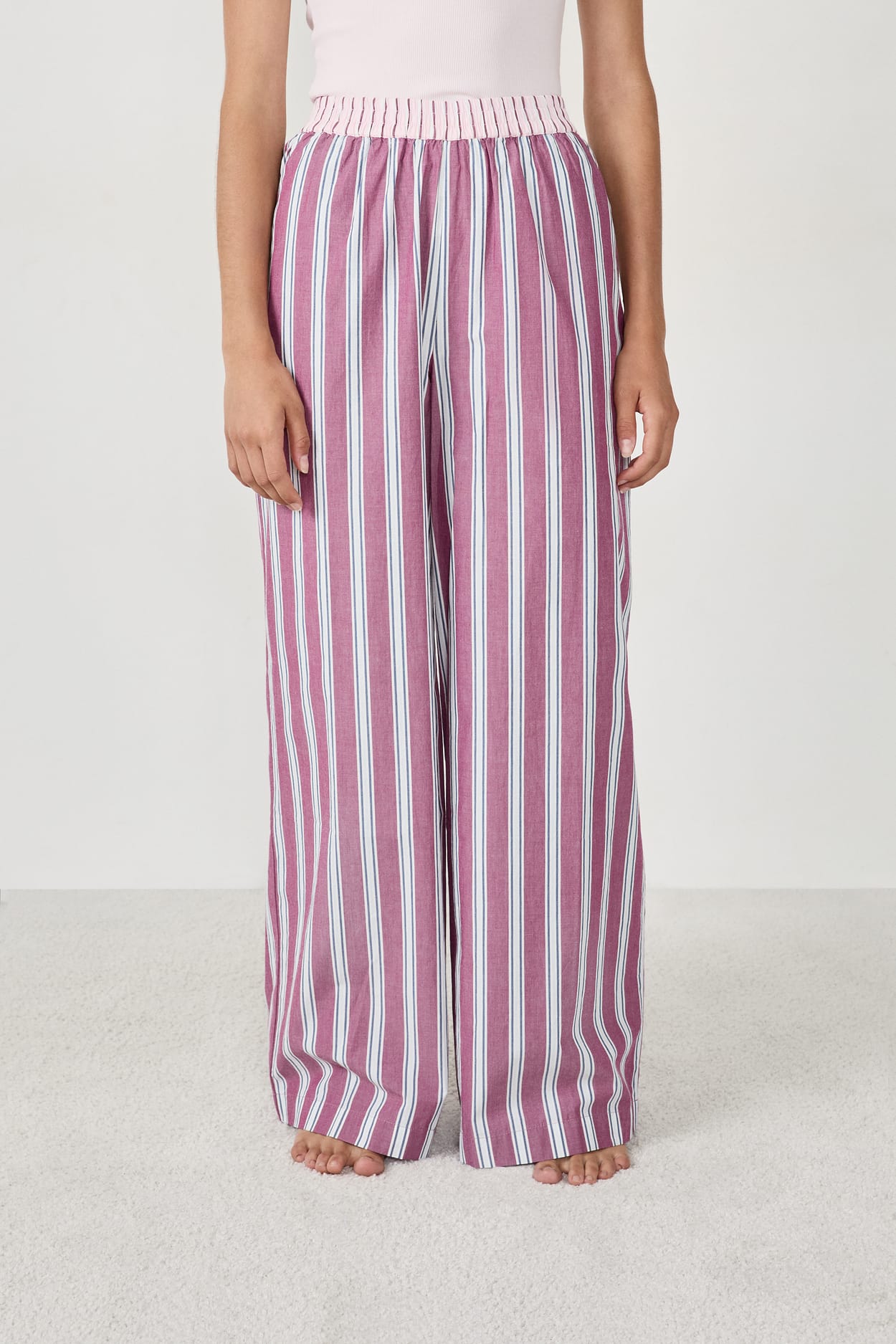 Doux et réconfortant, ce pantalon de pyjama est confectionné en coton. Sa coupe large et fluide apporte légèreté et mouvement, réhaussée par un motif à rayures et une taille élastique contrastée.