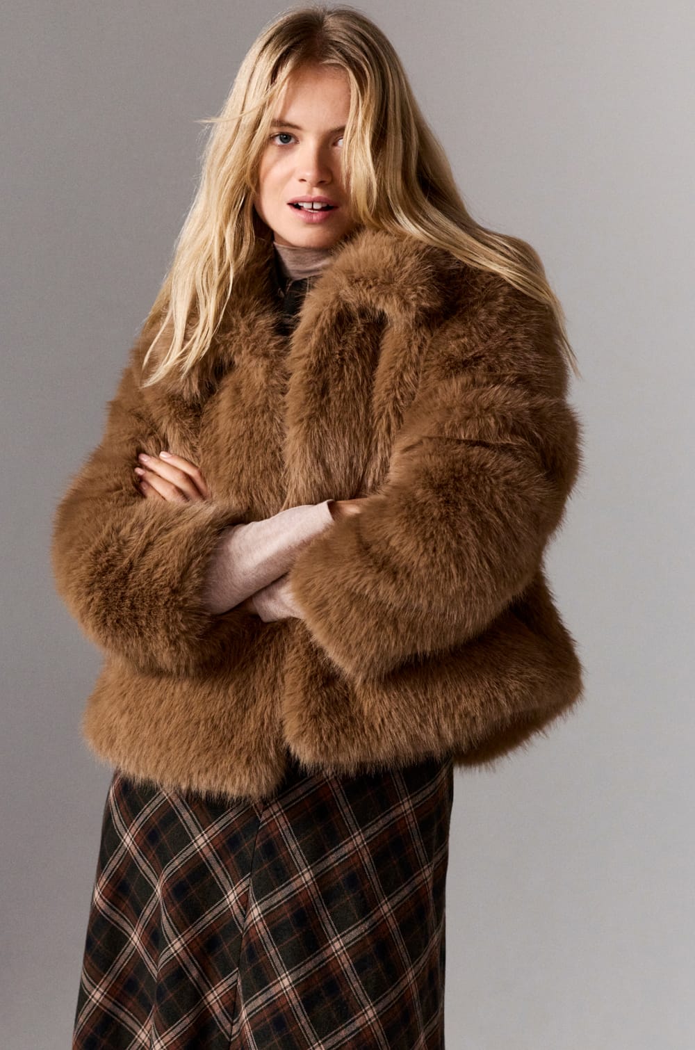 The iconic short faux fur coat makes its return. It features long sleeves and a classic collar....