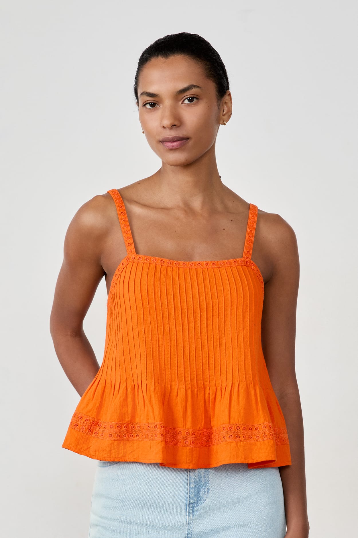 With delicate lace and a slightly ruffled edge, this tank top is light and airy. It also features thin straps....