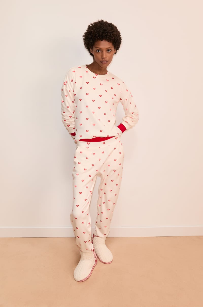 Idéal pour rester au chaud, cet ensemble de pyjama opte pour un effet velours. Il est réhaussé d'un imprimé cœurs...