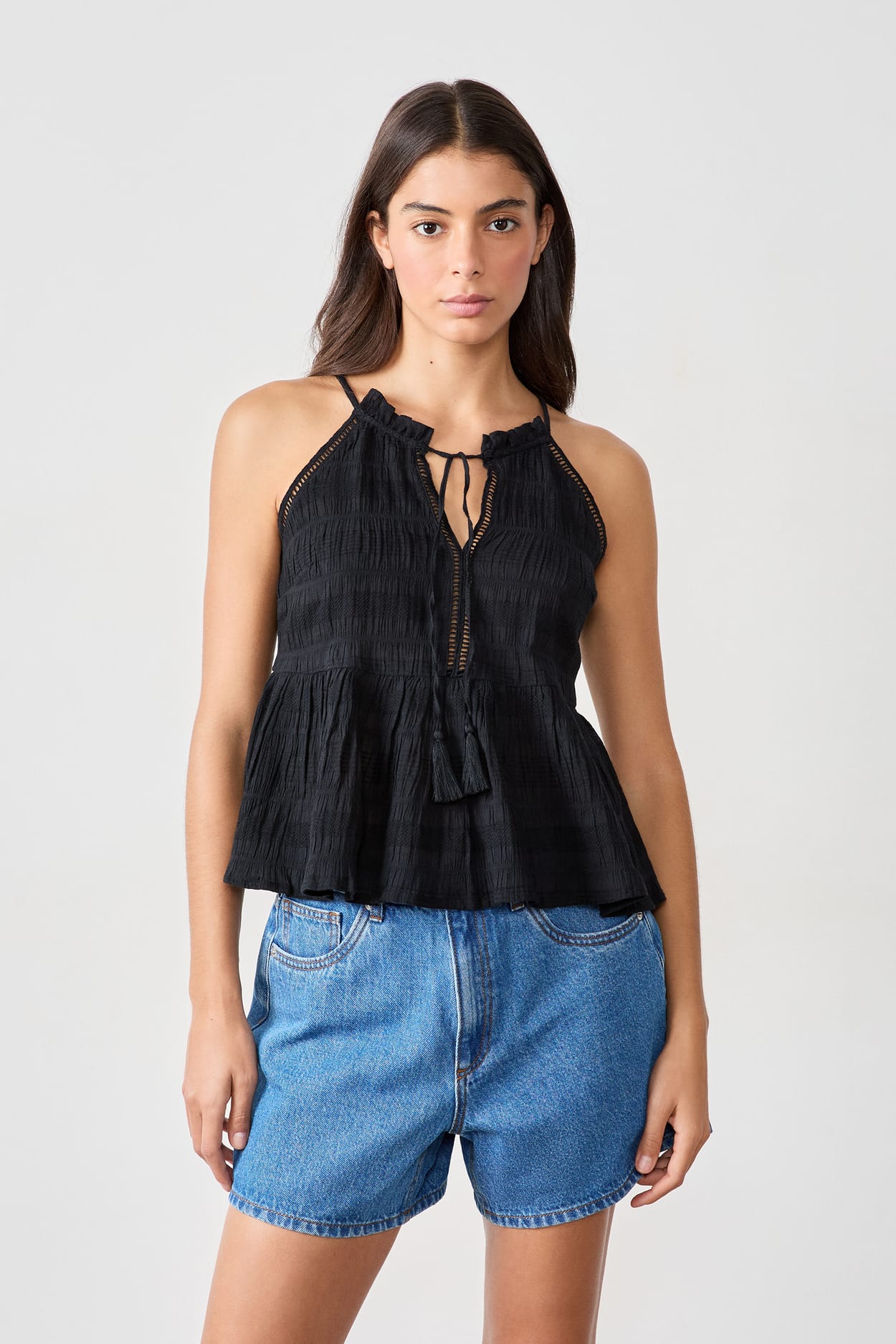 Delicate finishes, openwork details and tie knots on the front: the tank top is reinvented with finesse to enhance the s...
