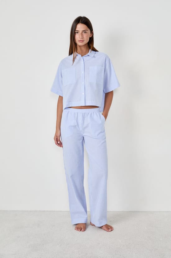This cotton pyjama shirt combines elegance with its stripes and floral patterns. It features a button-up closure and lon...