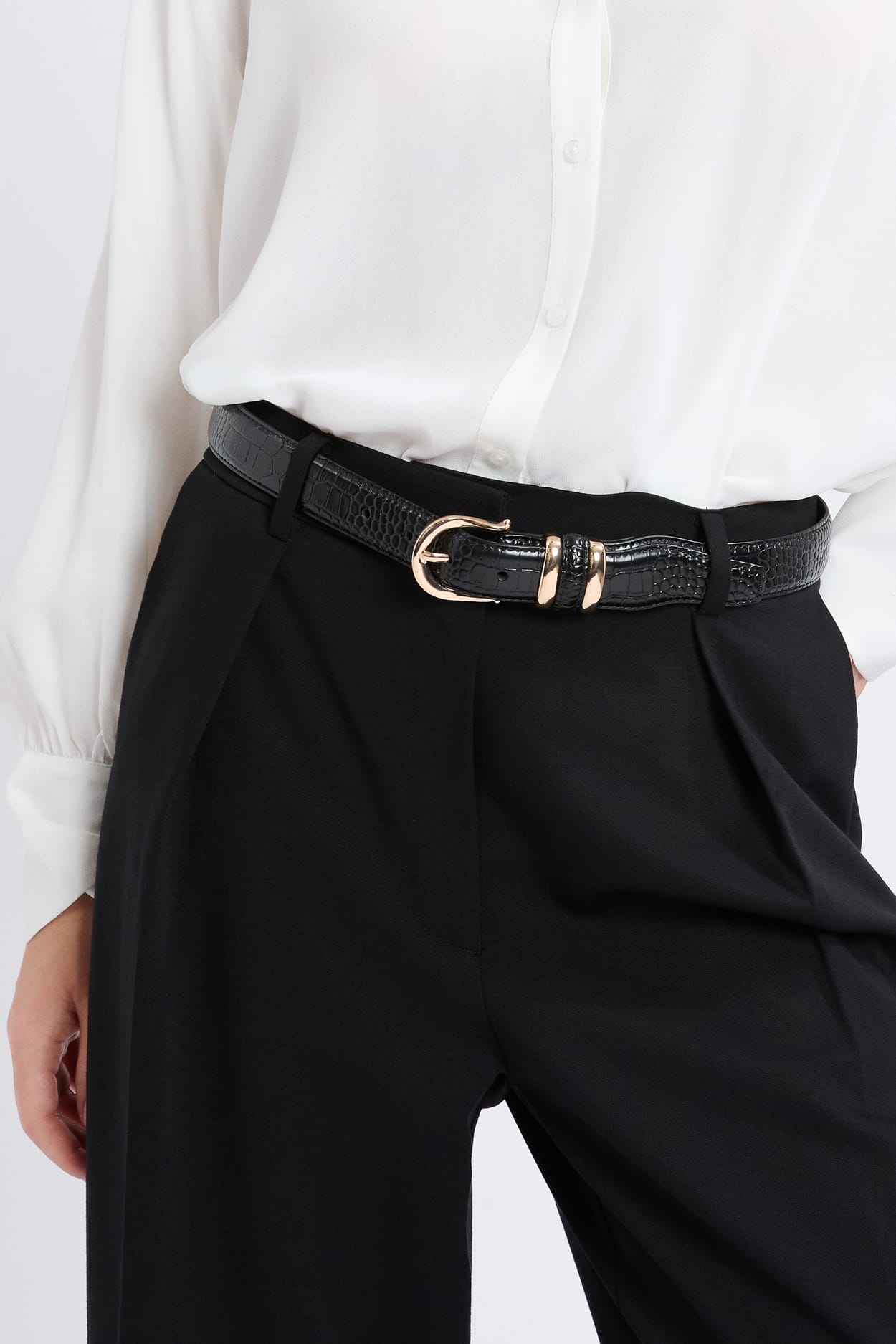 Perfect for energising a look, this leather belt features a python effect and a gold buckle....