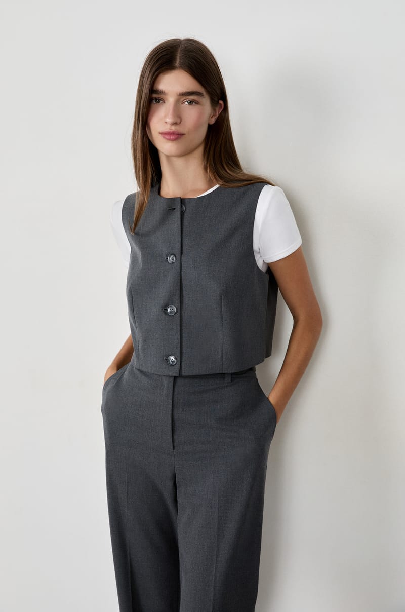A wardrobe essential, the iconic sleeveless cardigan is revisited with a short cut and round neck....
