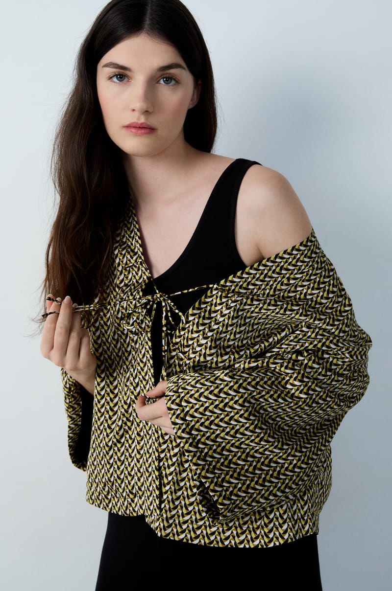 \nA true centerpiece of your nighttime look, this 3/4 sleeve robe charms with its loose fit and elegant print. Tie strings delicately enhance the silhouette. Underneath, a light ribbed tank top with a round neck completes the ensemble. The matching trousers add the final touch to this trio.