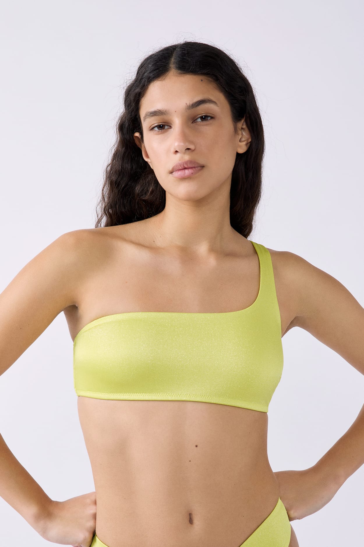 The iconic bralette shape reveals an irresistible asymmetric cut. With its bandeau, it offers ideal support. Its metalli...