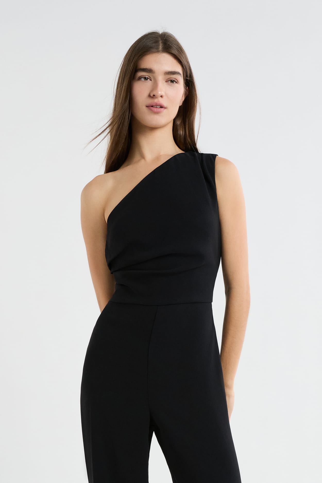 Sobre et élégante, cette combinaison pantalon opte pour un col plissé et une forme asymétrique. Elle offre une coupe cintrée et met en valeur la silhouette.