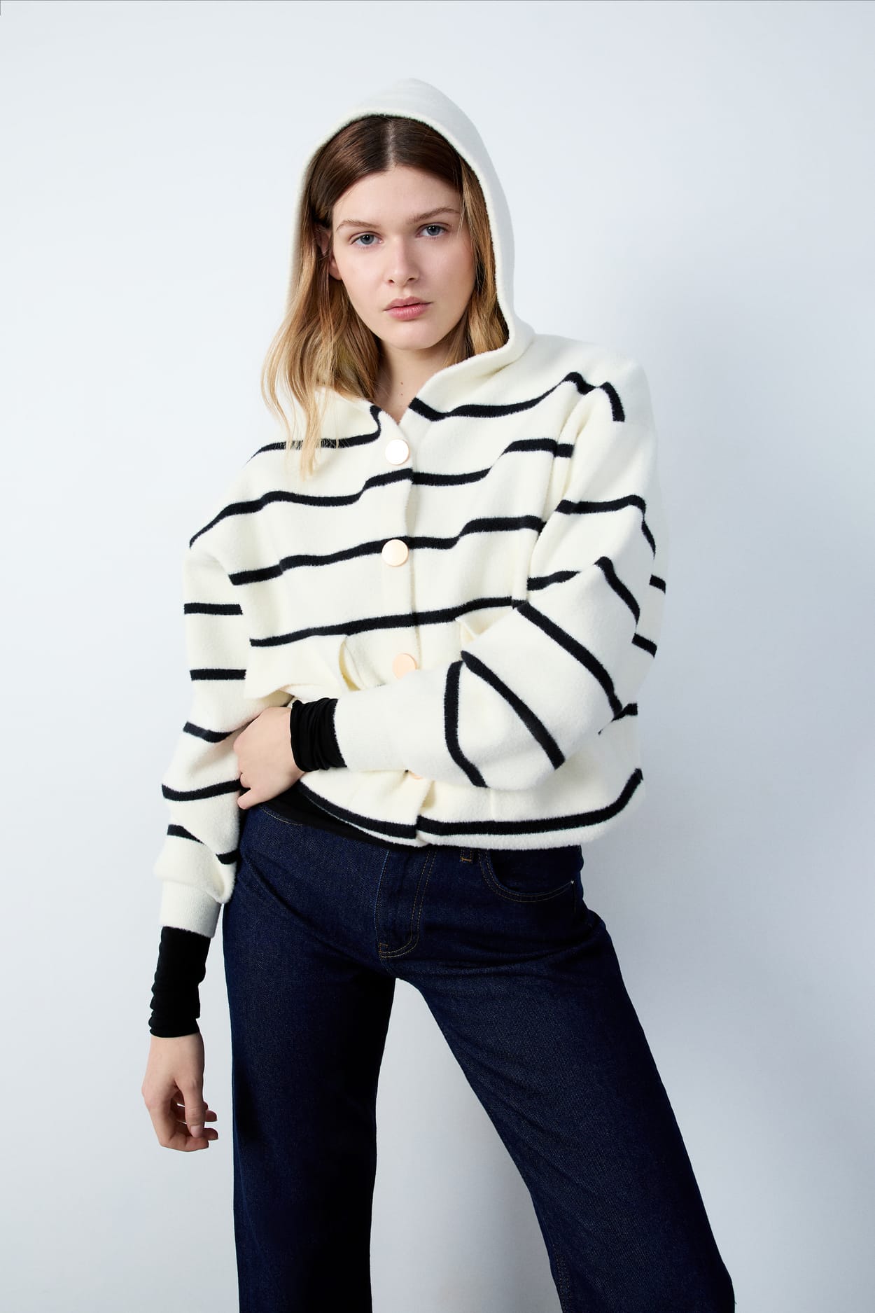 La marinière se réinvente dans cette version ultra douce à capuche. Un gilet en maille rayée, muni de manches longues, d...