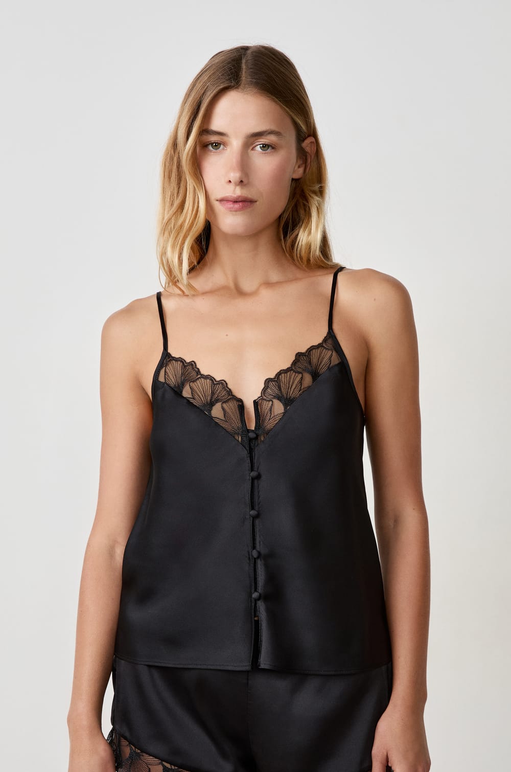 Satin adorns this camisole, which reveals delicate seams between meticulously crafted lace and a row of buttons decorating the front. Thanks to its thin adjustable straps, it adapts perfectly to your silhouette