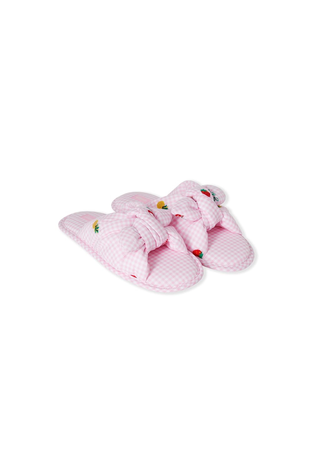 Ces chaussons en coton au motif vichy se distinguent par leur nœud décoratif à motifs fruits. Leur forme confortable et ...