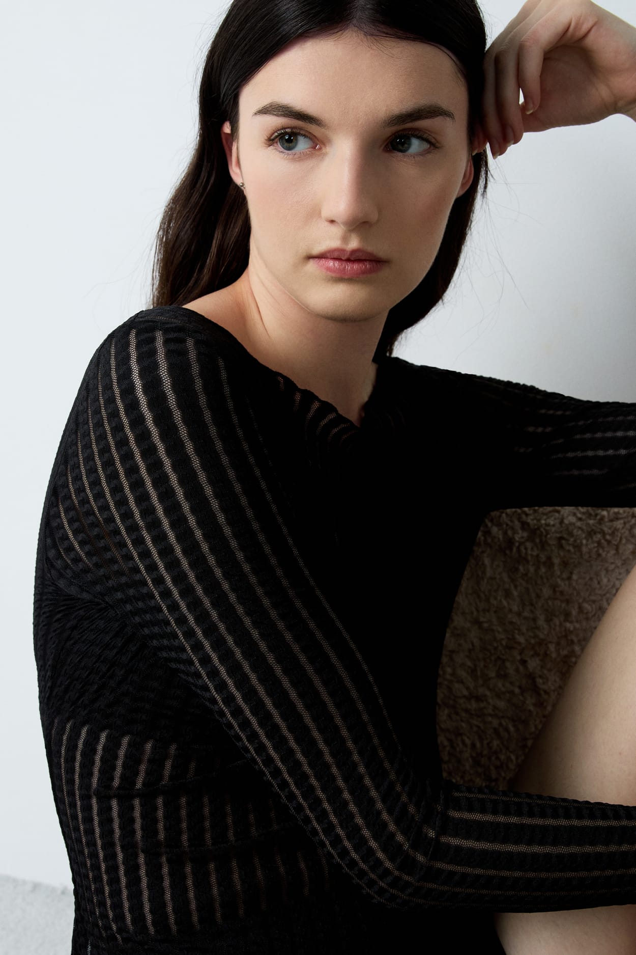 This little long-sleeved top, subtly transparent, delicately reveals the skin. Its slightly cropped cut and round neckli...