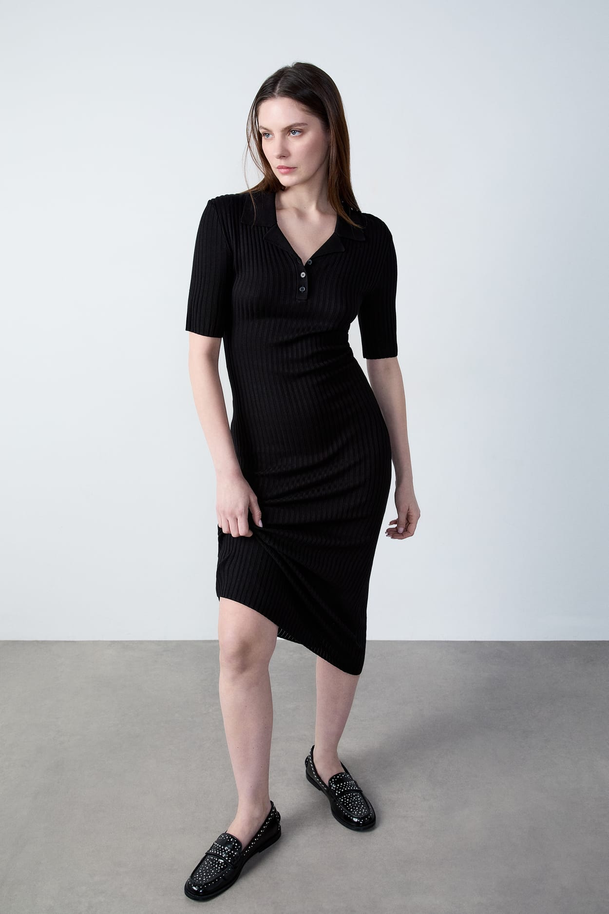 Delicately ribbed, this long dress embodies elegance. With its short sleeves and shirt collar, it redefines curves and g...