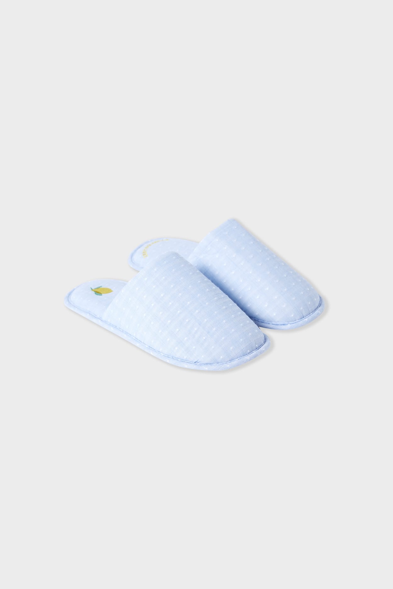 These mule slippers invite delicacy. They are adorned with subtle polka dot patterns, an embroidery saying "un zeste...