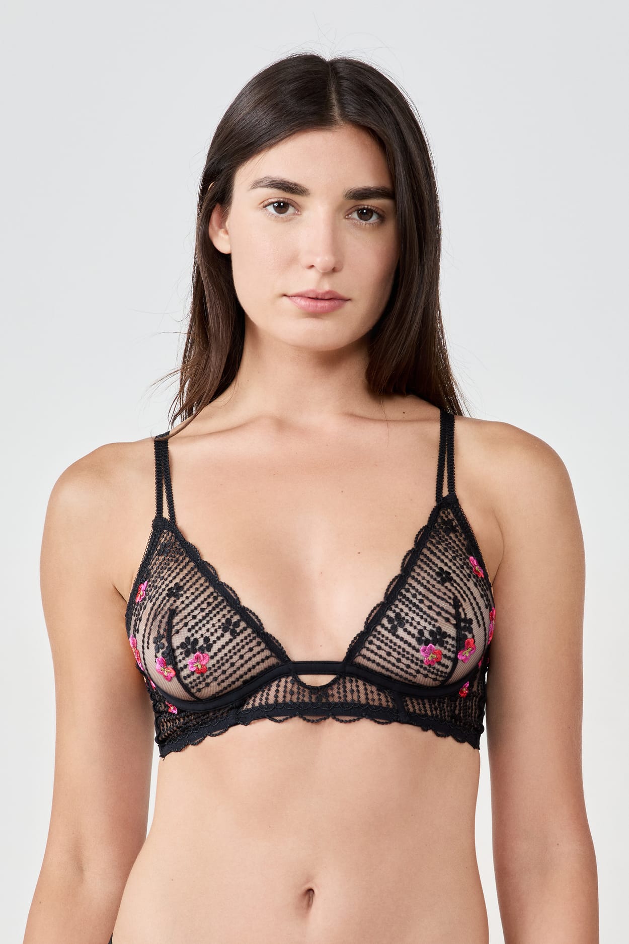 Parfait pour sublimer votre lingerie, ce soutien-gorge opte pour une forme classique en dentelle avec armatures. Il est réhaussé de broderies fleuries colorées et de bords festonnés pour souligner une allure féminine.