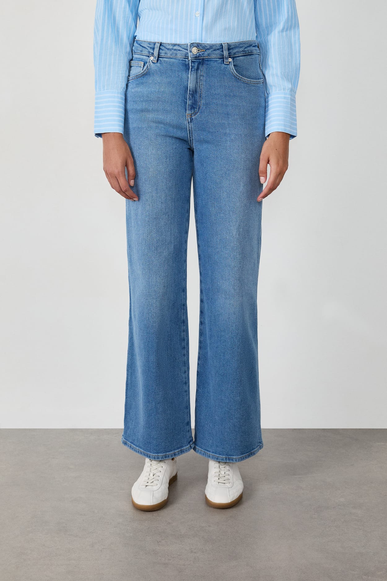 Ce jean en coton arbore une coupe droite pour allonger la silhouette. Il est menu d'un bouton métallique argenté. A...