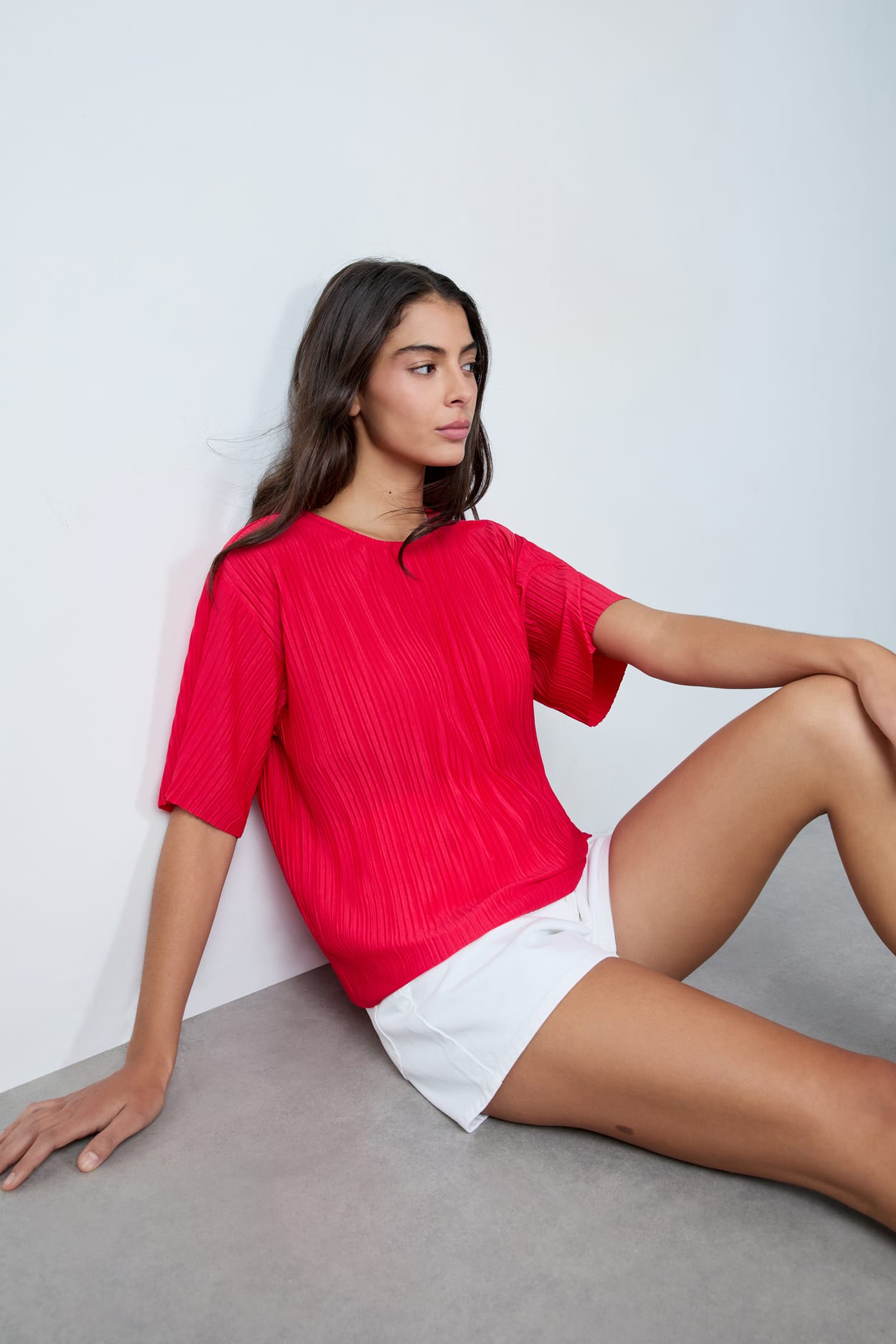 This top is reinvented with elegance thanks to its pleated details.Its cut, featuring a collar and short sleeves, is ide...