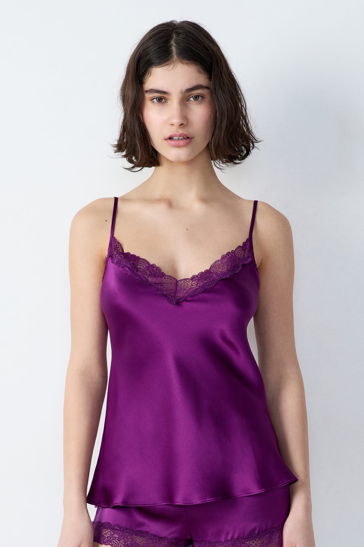 Delicately adorned with floral lace, this camisole can be worn both casually with jeans and a knit jumper, or as refined nightwear.