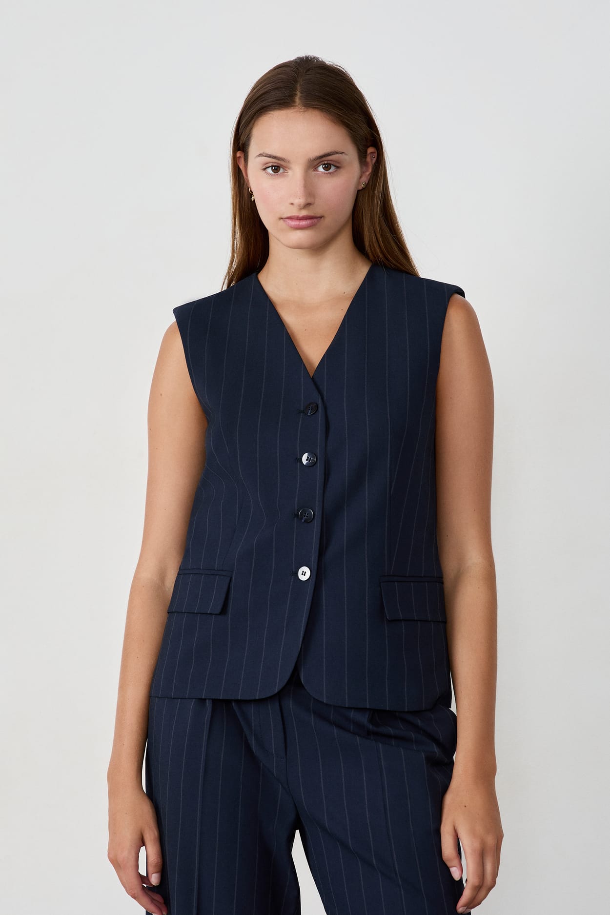 A wardrobe essential, the iconic sleeveless cardigan is dressed in stripes. It can be worn alone or layered....